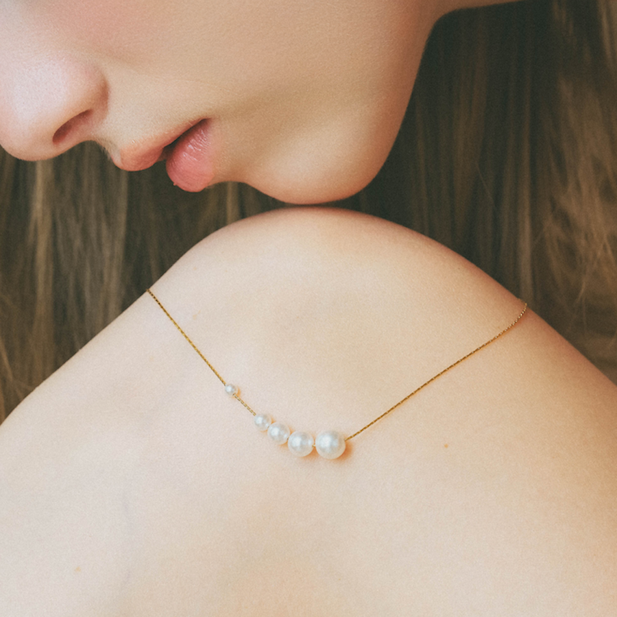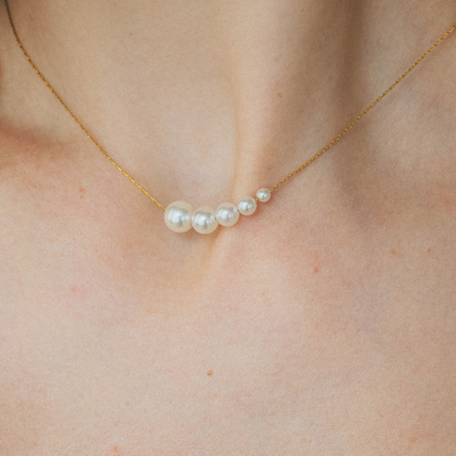 異なるサイズのパールが優雅に並ぶ、洗練されたデザインのネックレス。