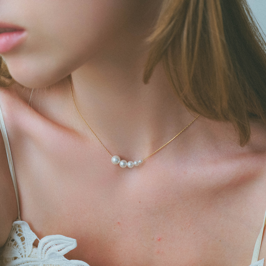 細めのチェーンと、パールの艶めきが美しく調和し、デコルテを上品に演出します。