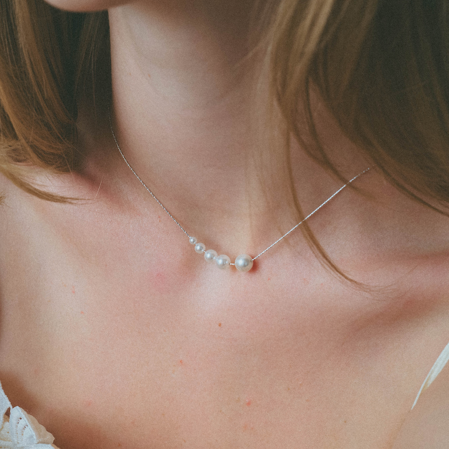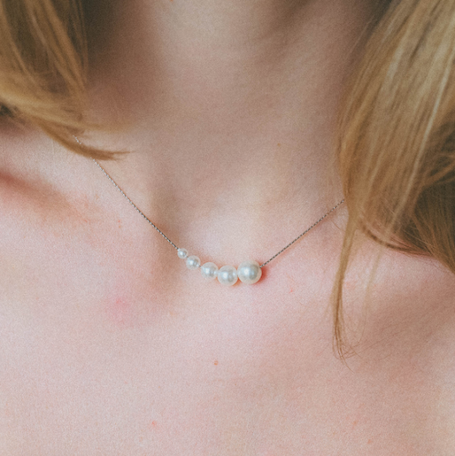 異なるサイズのパールが優雅に並ぶ、洗練されたデザインのネックレス。