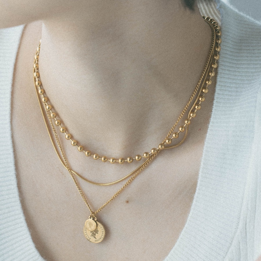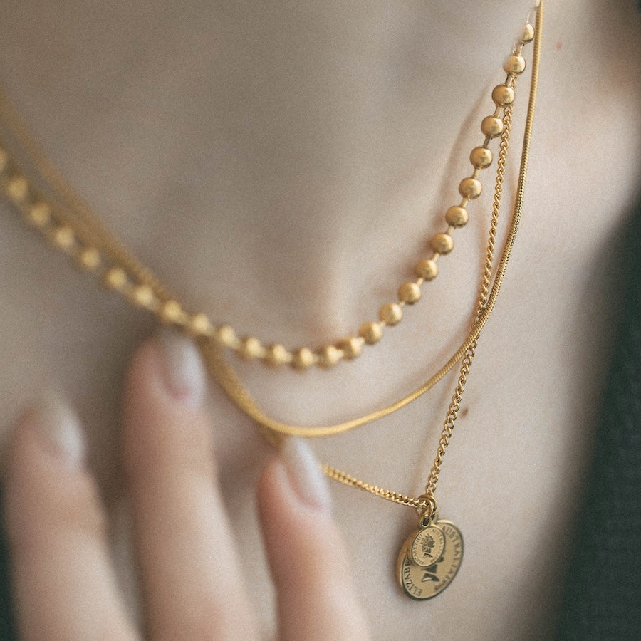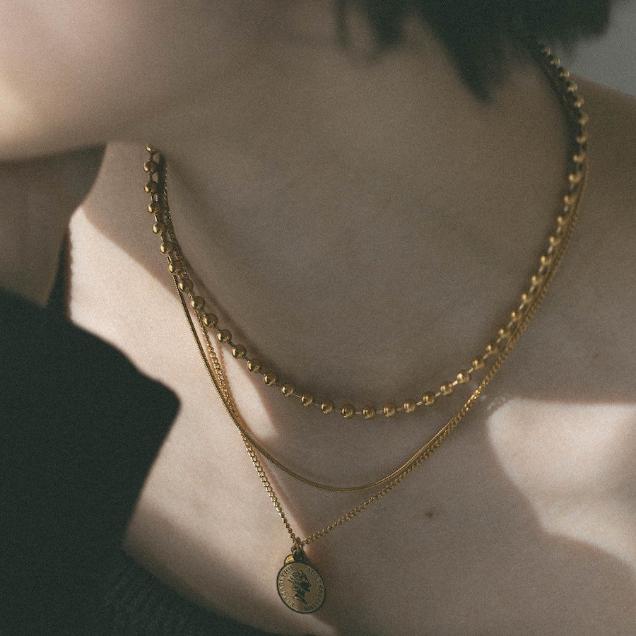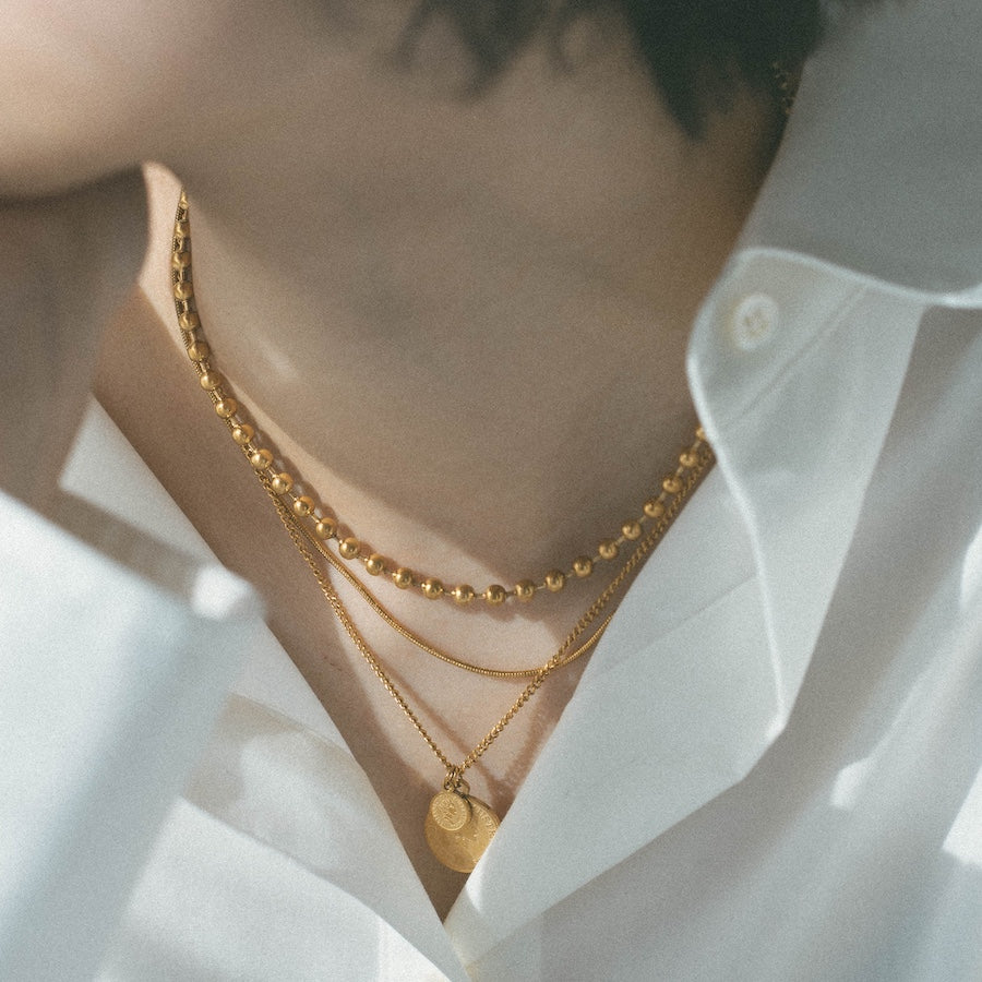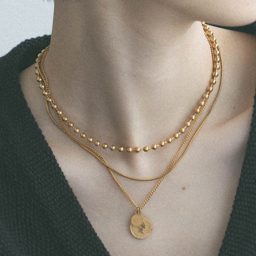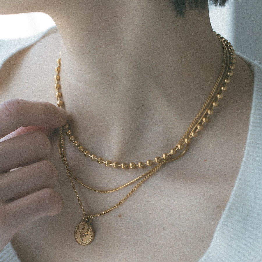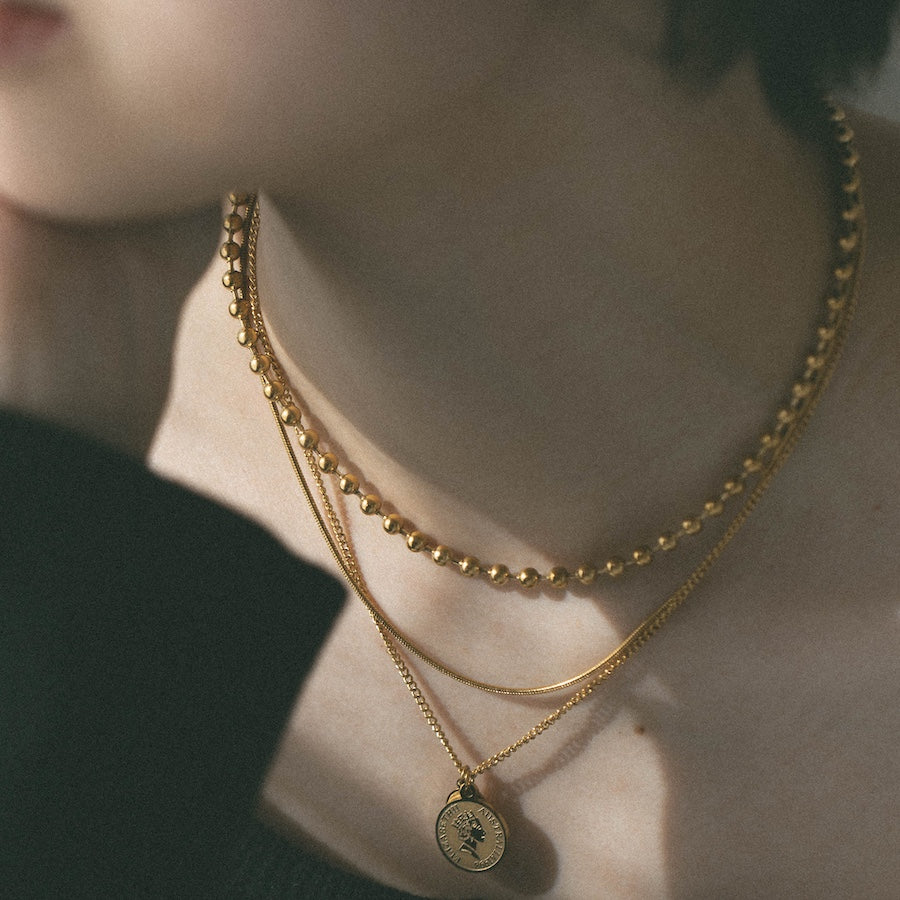 異なるデザインのチェーンが繊細に重なり合う、洗練されたレイヤードネックレス。