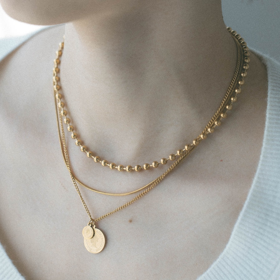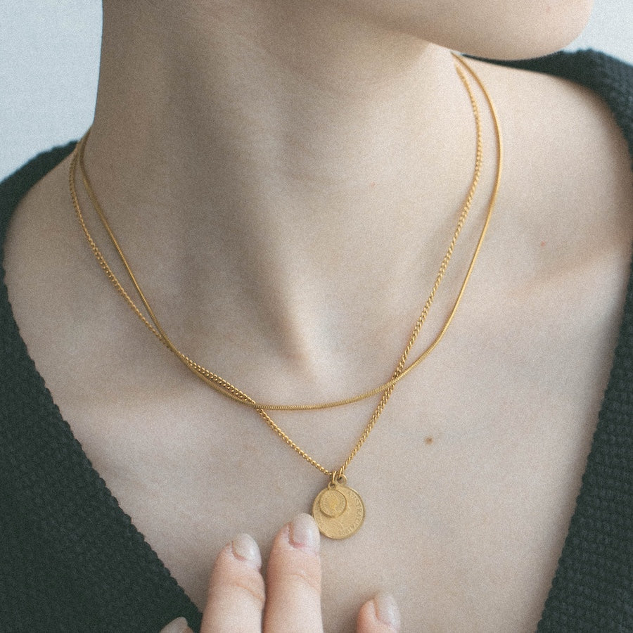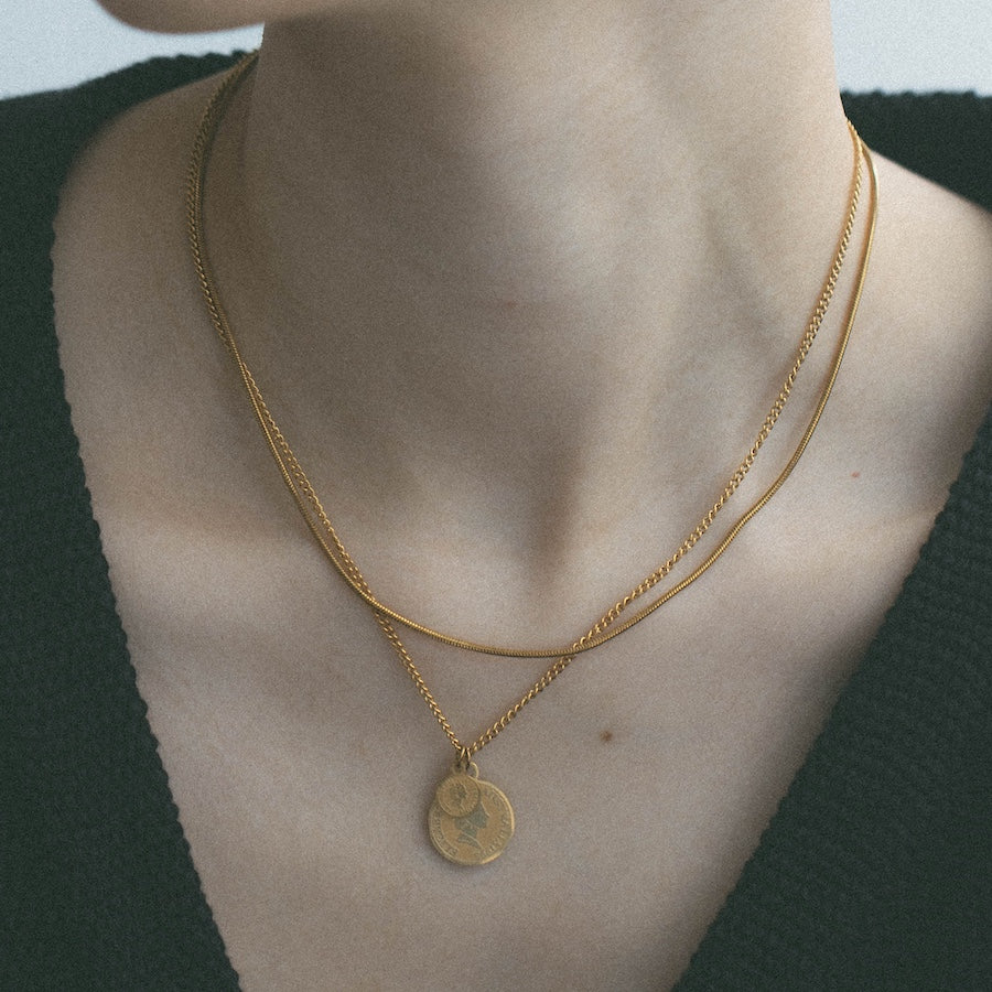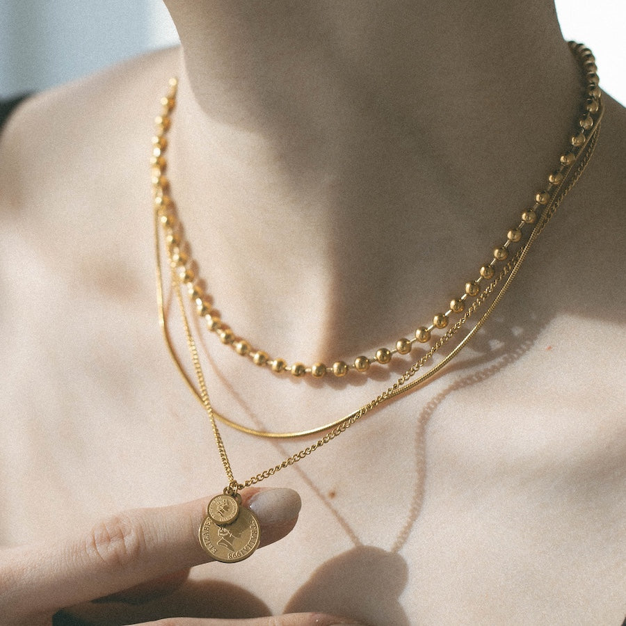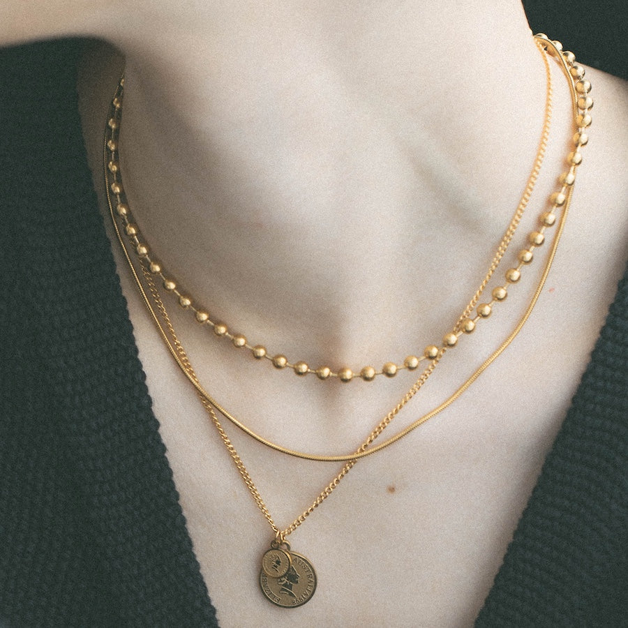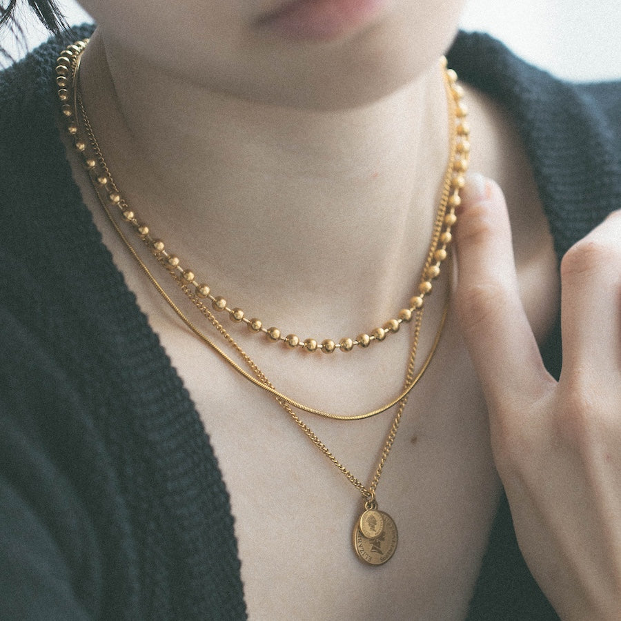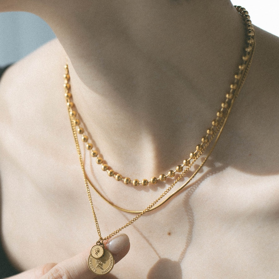 異なるデザインのチェーンが繊細に重なり合う、洗練されたレイヤードネックレス。