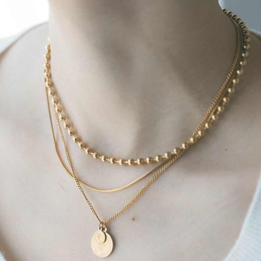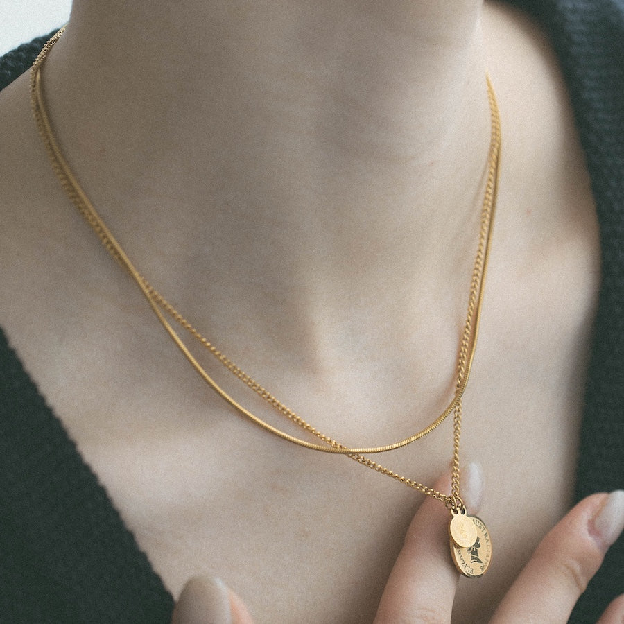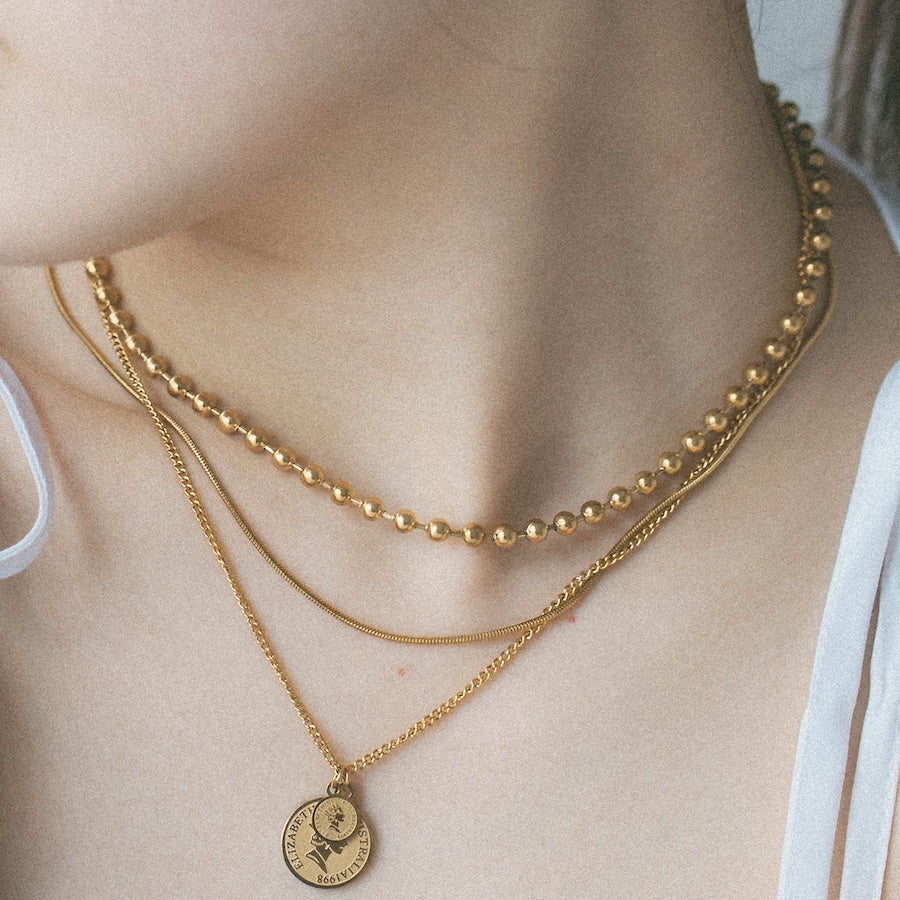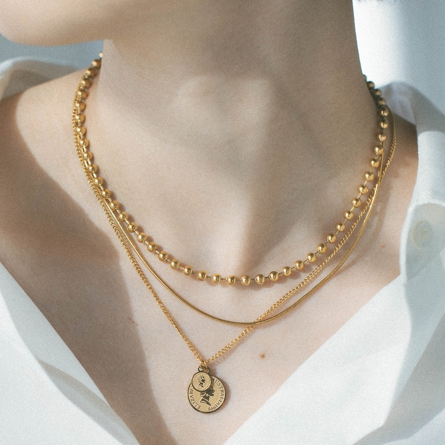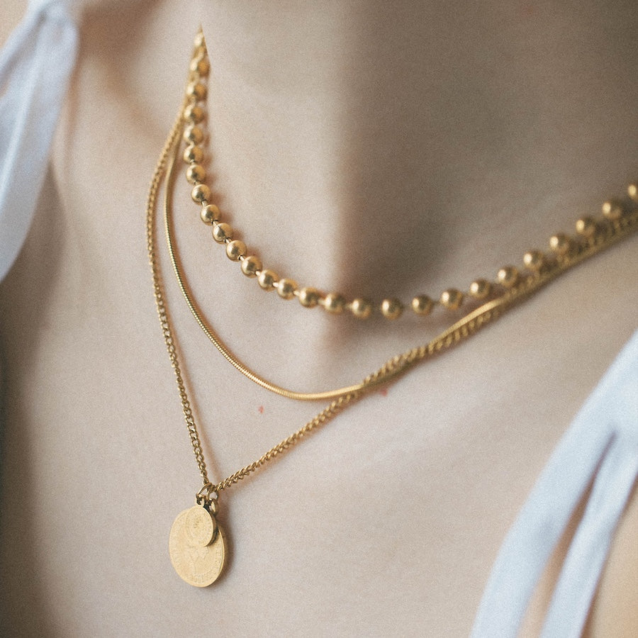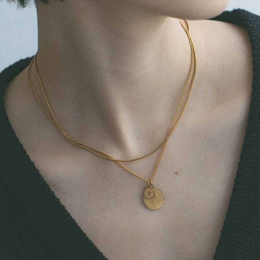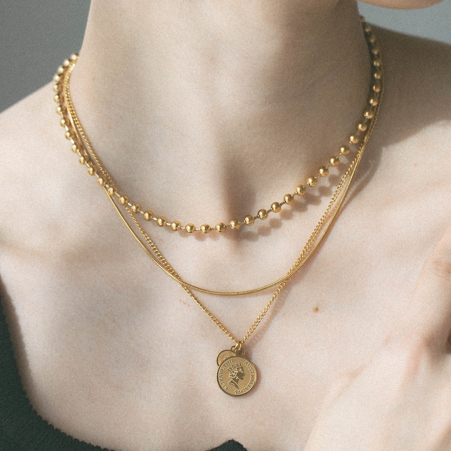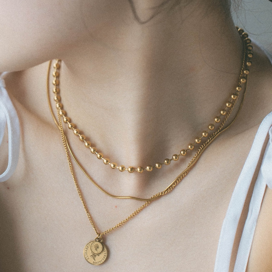 異なるデザインのチェーンが繊細に重なり合う、洗練されたレイヤードネックレス。