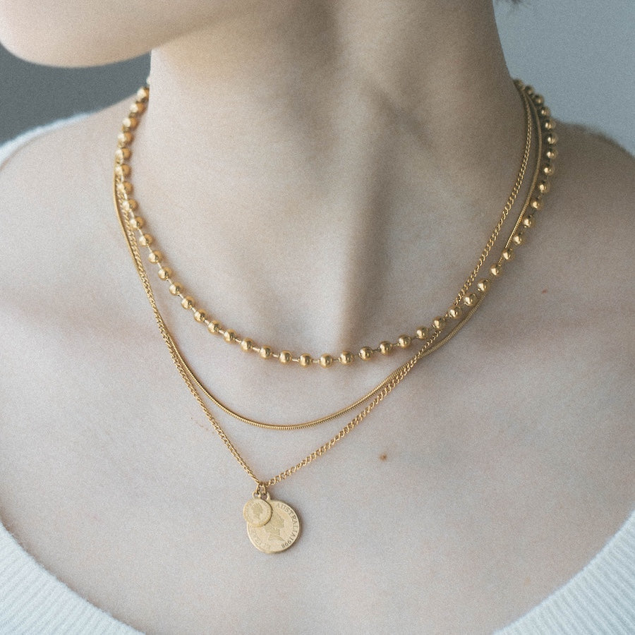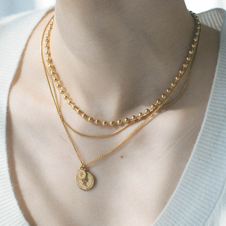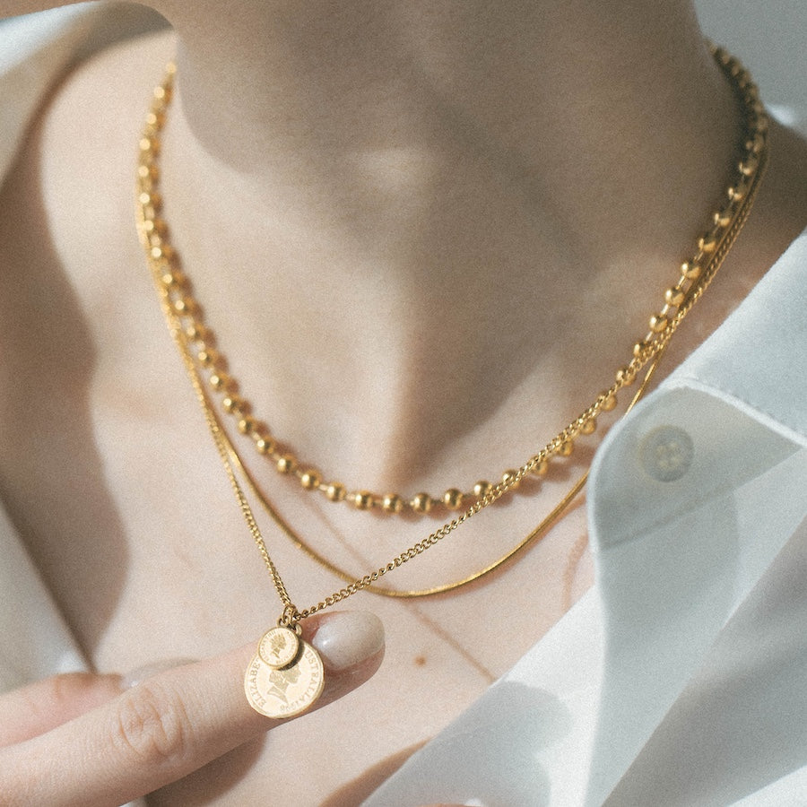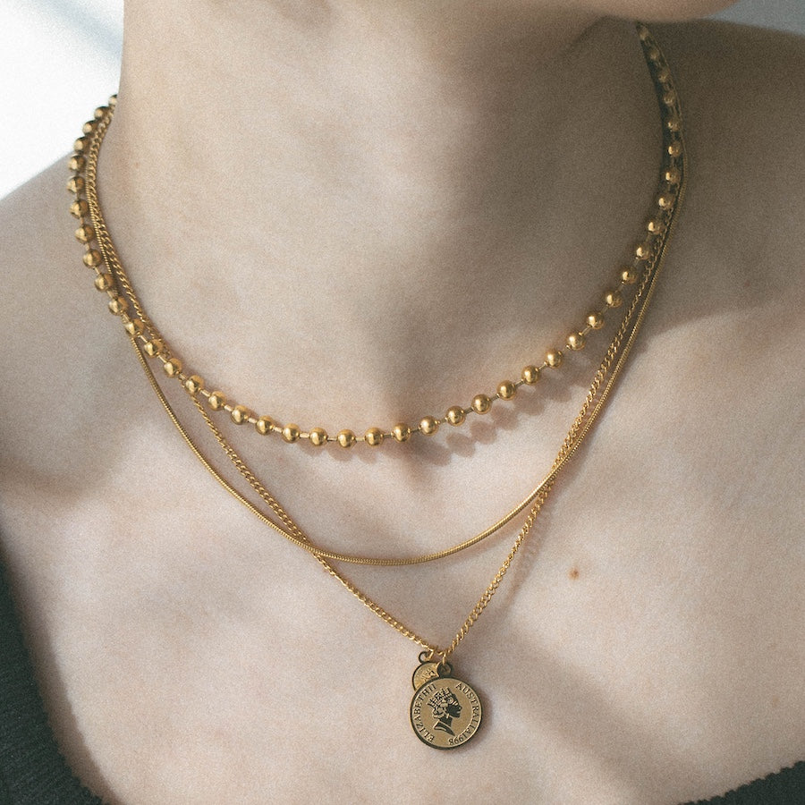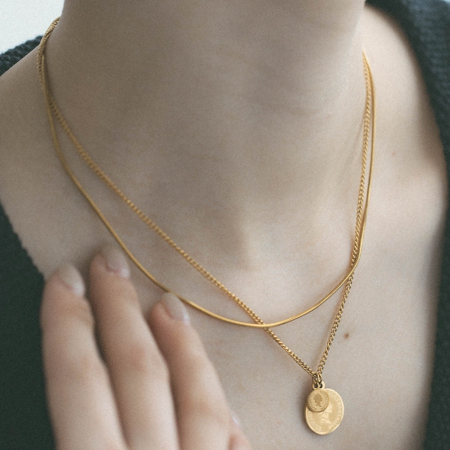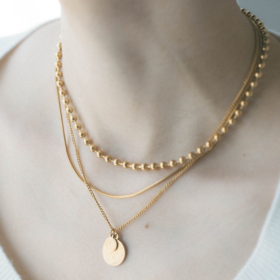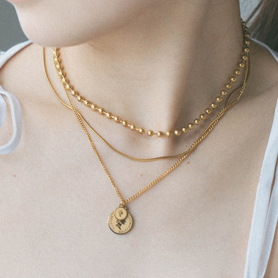 異なるデザインのチェーンが繊細に重なり合う、洗練されたレイヤードネックレス。