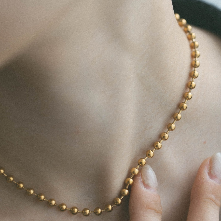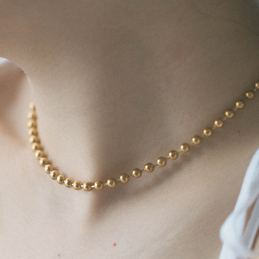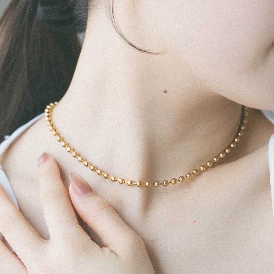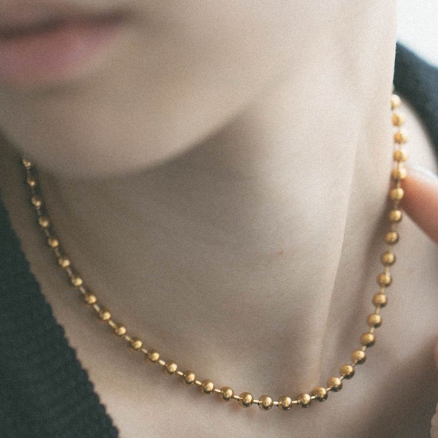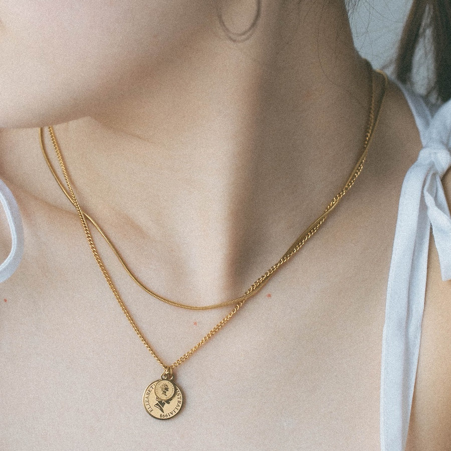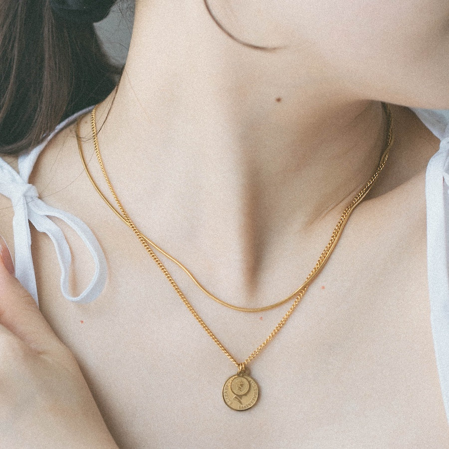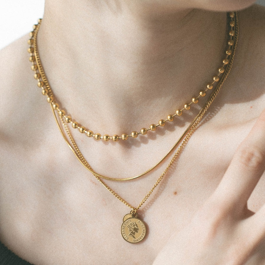 異なるデザインのチェーンが繊細に重なり合う、洗練されたレイヤードネックレス。