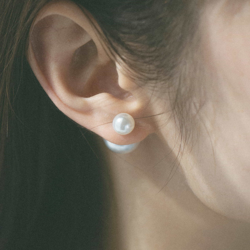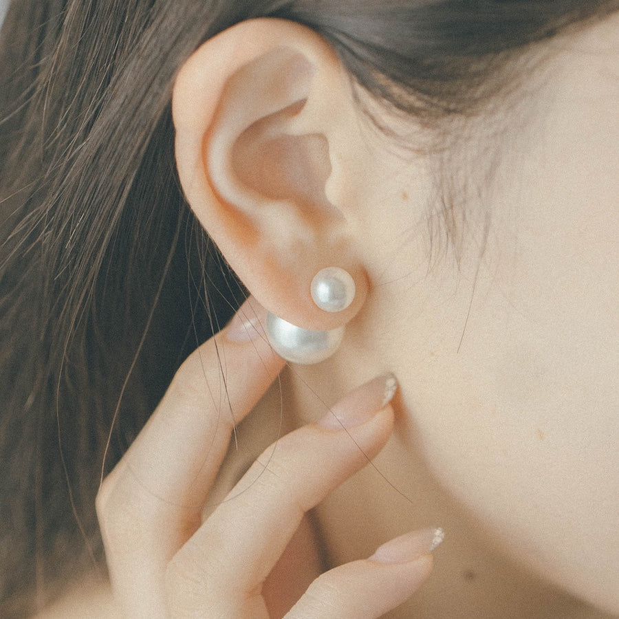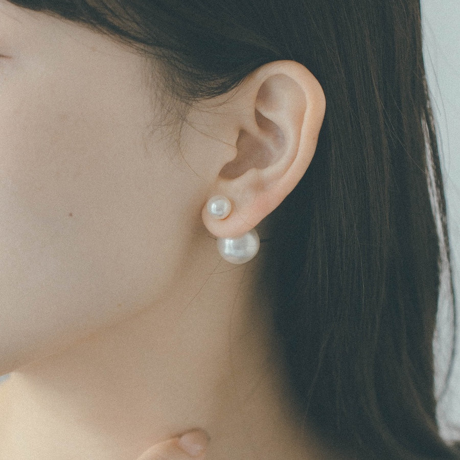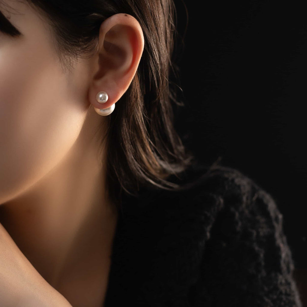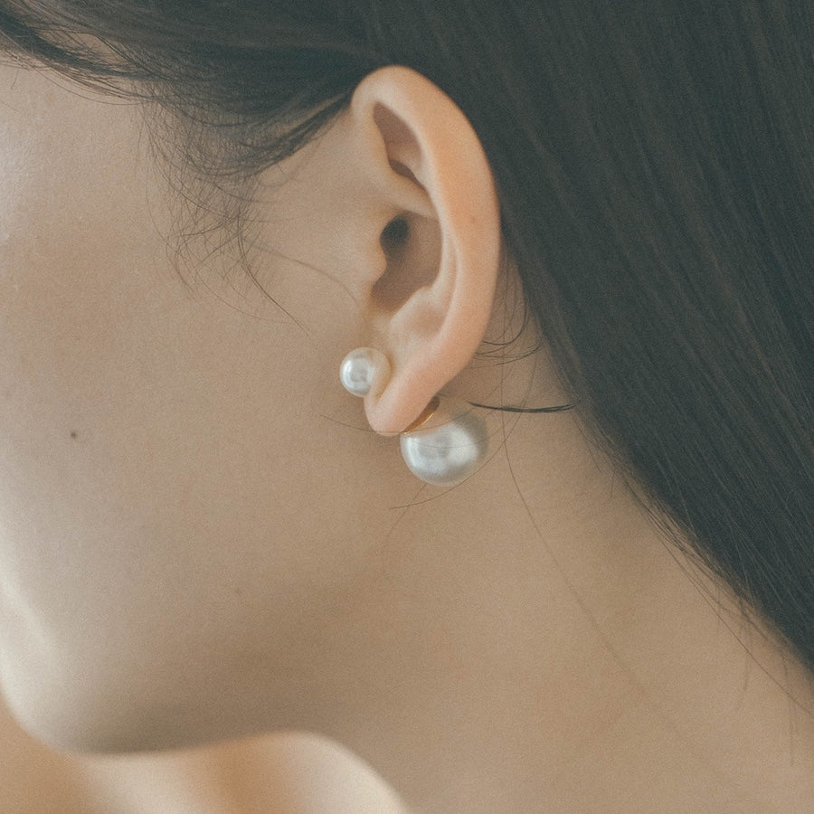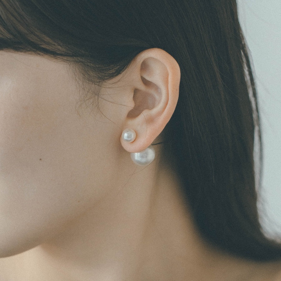 トップだけではなくキャッチもパールのダブルピアスは、呼ばれて振り向くそのすべての瞬間に上品な印象を与えます。