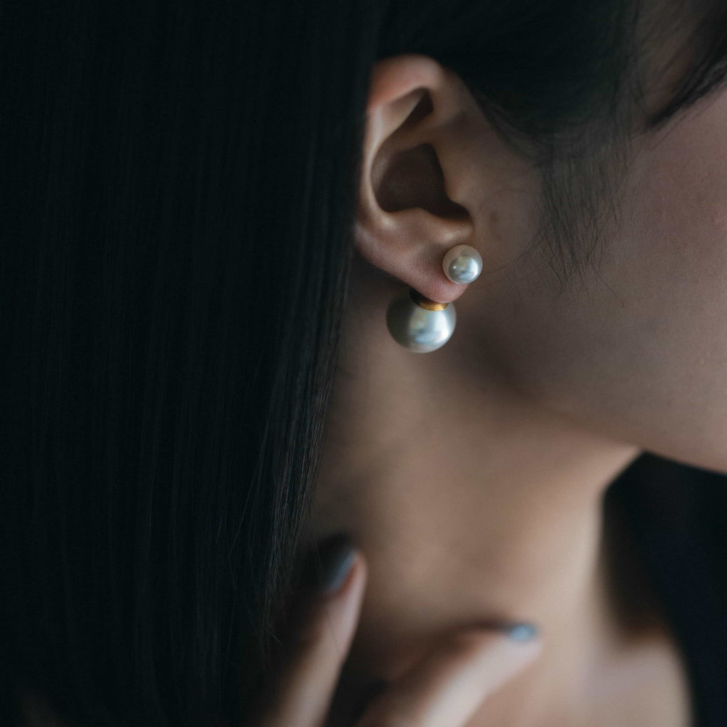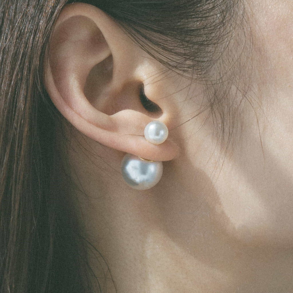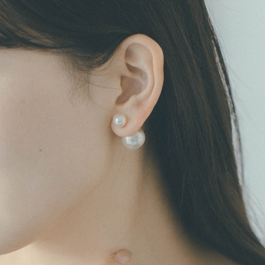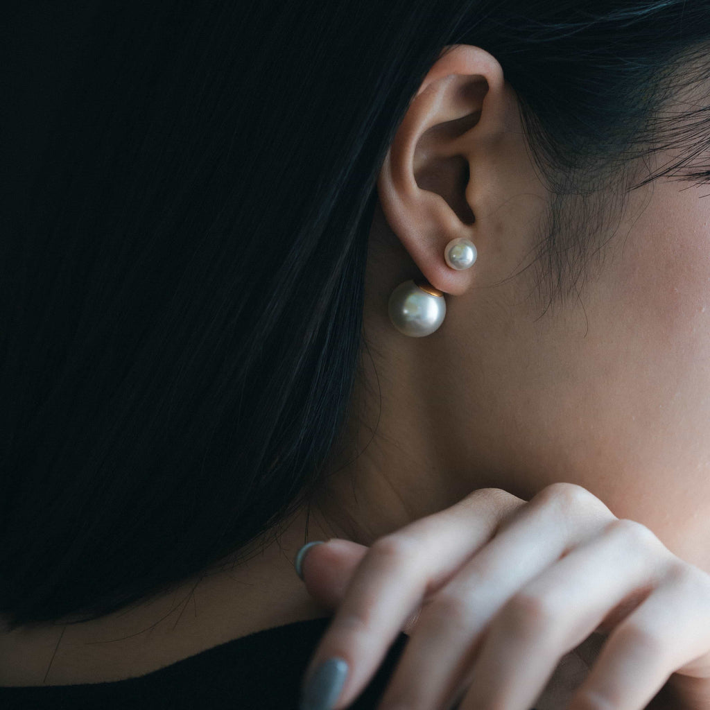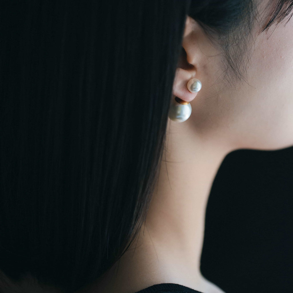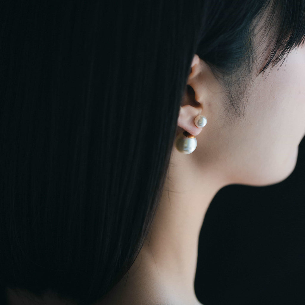 トップだけではなくキャッチもパールのダブルピアスは、呼ばれて振り向くそのすべての瞬間に上品な印象を与えます。